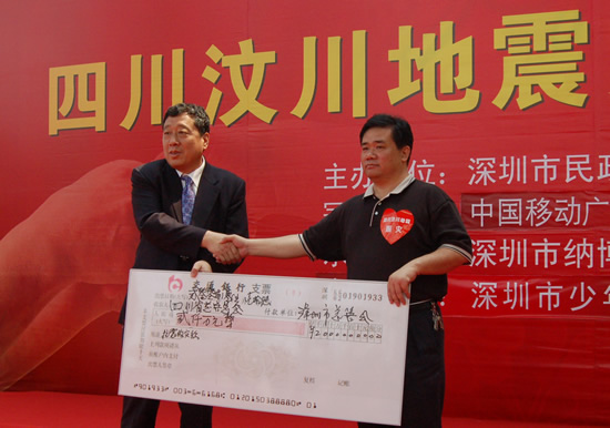 此次募捐活动由市民政局、市慈善会联合主办,深圳移动冠名支持。在市少年宫水晶石大厅,福田区荔园小学、市服装行业协会、叶子服装、曼娅奴、特灵通数码通讯等十多家单位争相捐出善款,各界代表纷纷发送手机红段子表达对灾区人民的支持和祝福。