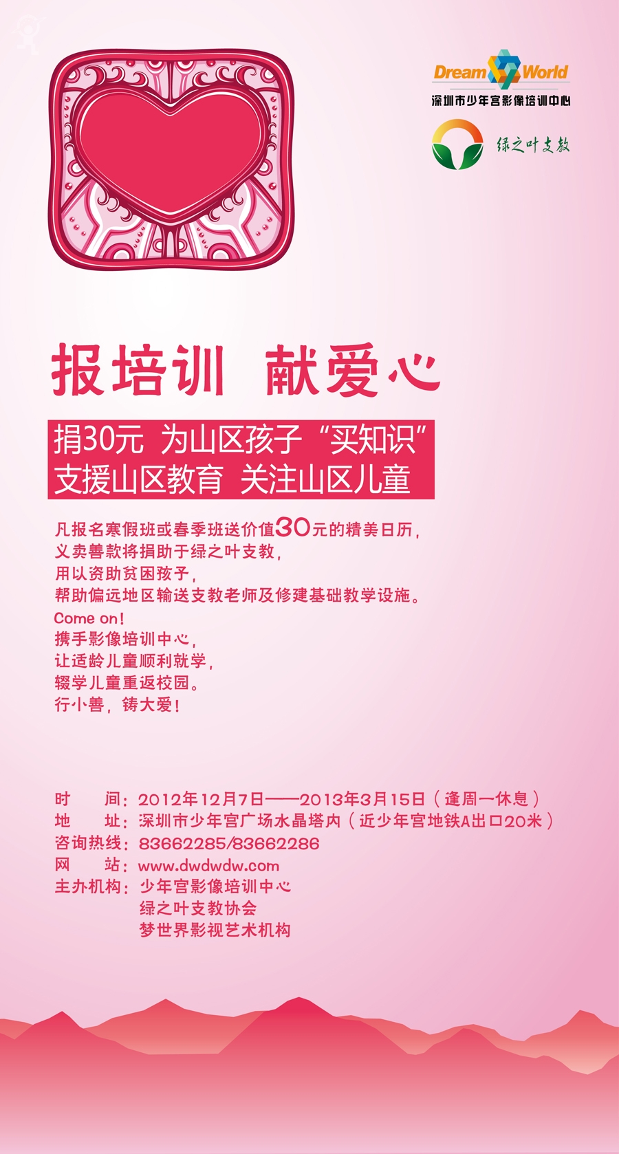 值此岁末年初之际,少年宫影像培训中心特联合绿之叶支教协会推出“‘爱心共成长’公益活动”,活动期间家长报名寒假班或春季班送价值30元的精美日历,义卖善款将捐助于绿之叶支教,用以资助贫困孩子,帮助偏远地区输送支教老师及修建基础教学设施。