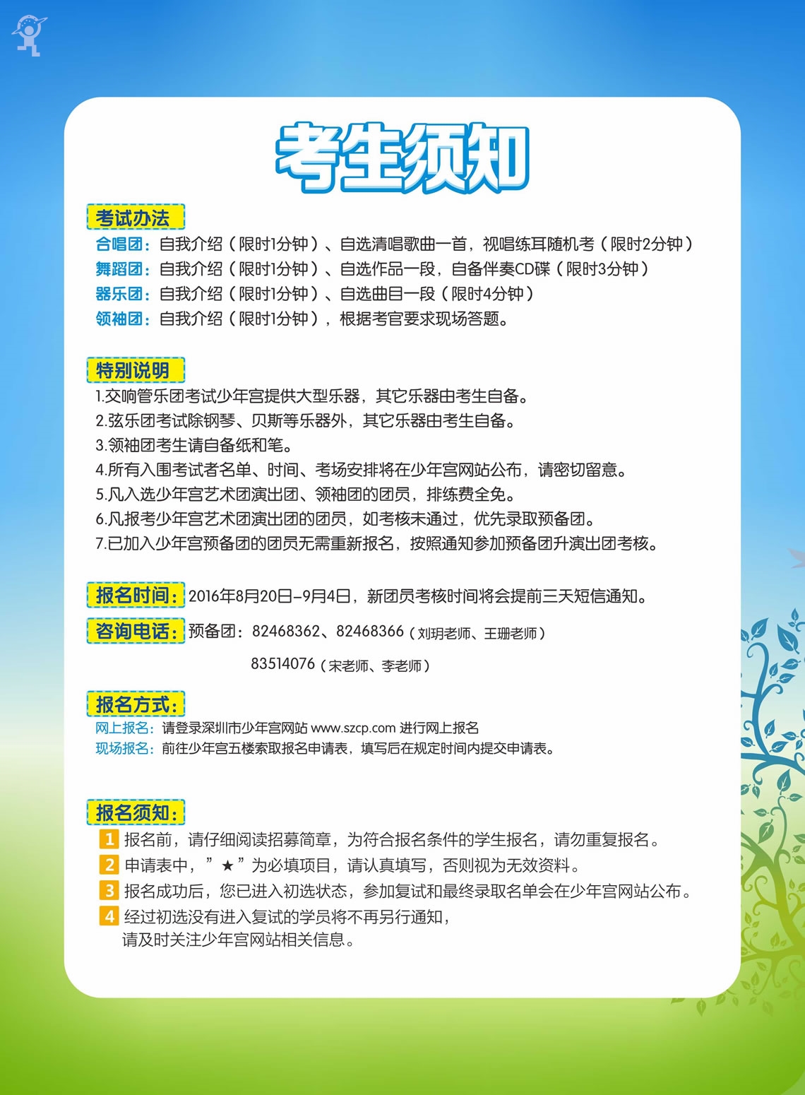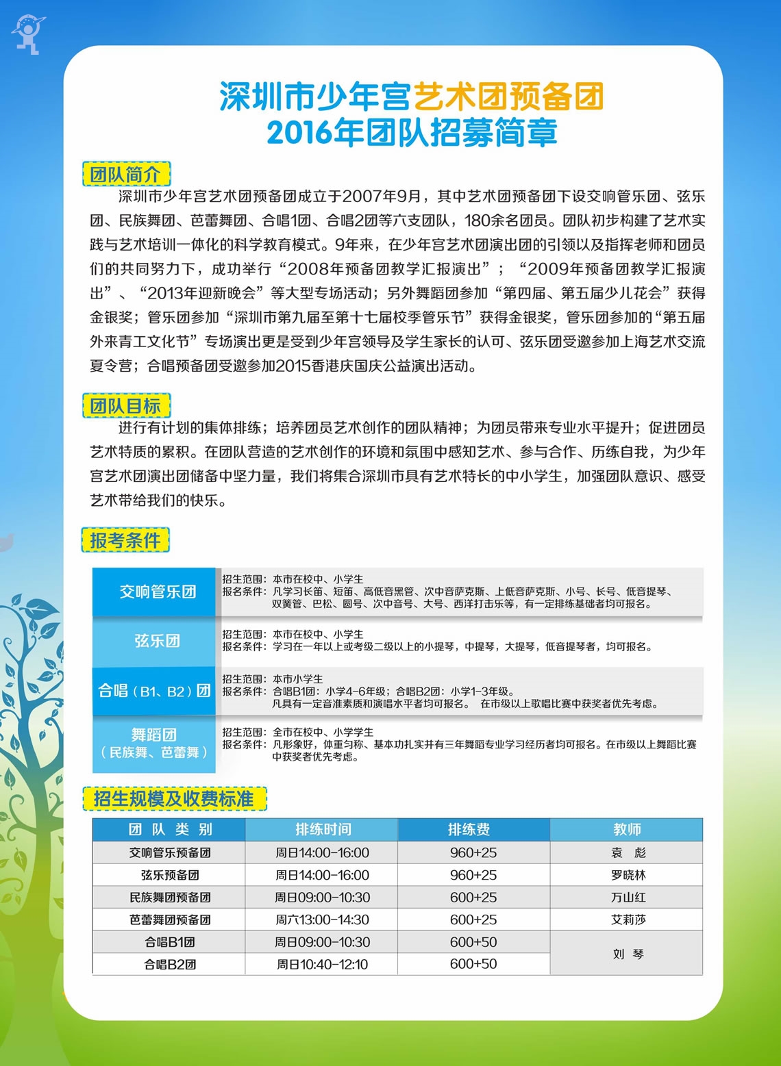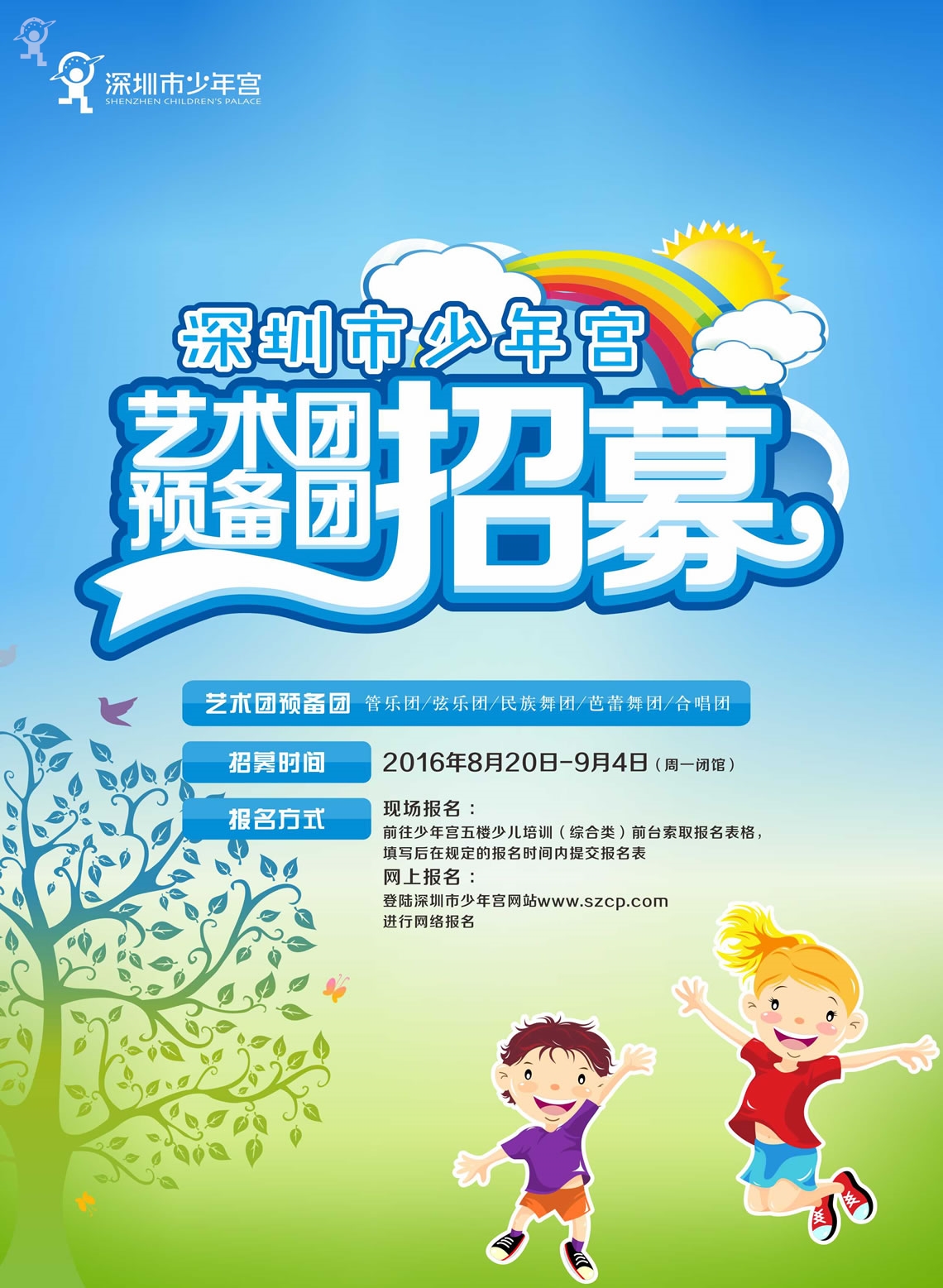少年宫艺术团队预备团现招募团员,目前招生的团队有交响管乐预备团、弦乐预备团、民族舞团预备团、芭蕾舞团预备团、合唱B1团、合唱B2团。报名方式有现场报名和网上报名两种,报名时间为2016年8月20日至9月4日(周一闭馆不接受现场报名)。
