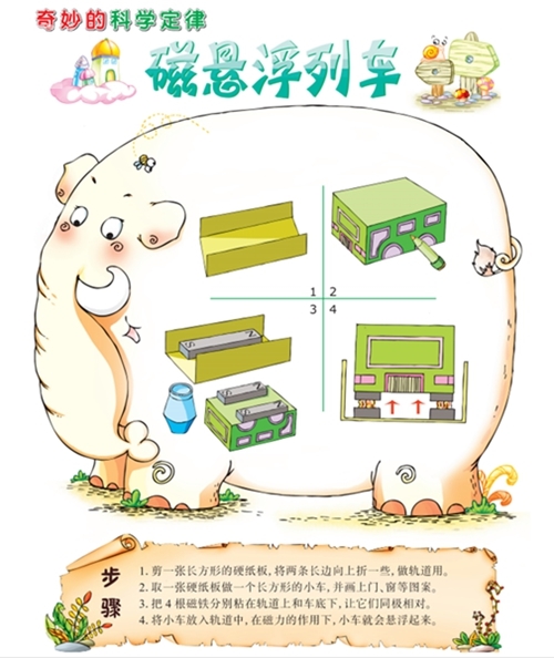 原理:磁铁的性质是:同极相斥,异极相吸。当小车底部和轨道上的磁铁同极相对时,由于斥力的作用,小车就会悬浮起来。