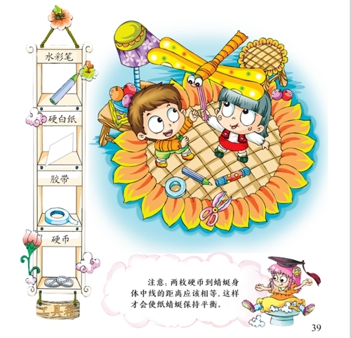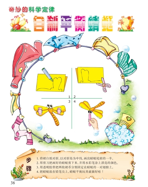 原理:纸蜻蜓的一对翅膀上粘了硬币,两边的重量达到了平衡,蜻蜓就不会从铅笔上掉下来,而且还会随着铅笔的晃动而扇动翅膀。