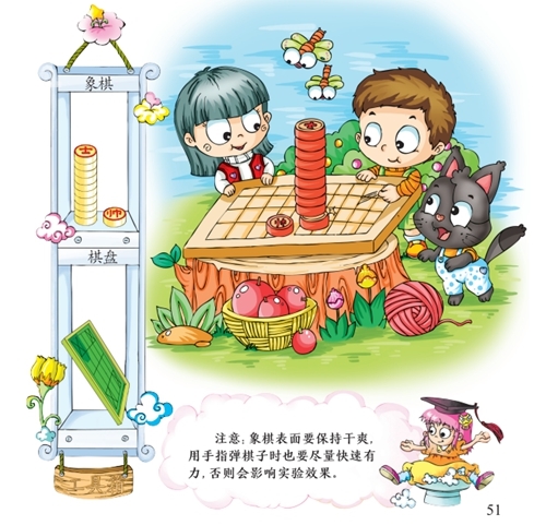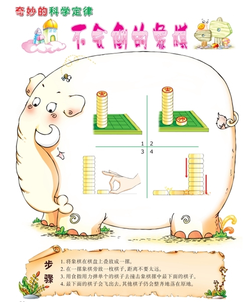 原理:由于惯性的作用,当棋子处于静止状态时,最下面的一枚棋子突然被弹出去,其他棋子依然会保持不动。