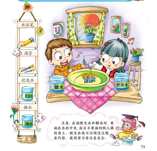 原理:肥皂会使水的表面张力变小,当滴入水中央后,纸人偶会被盆边上表面张力较大的水拉过去;而糖会使水的表面张力变大,所以滴入糖后,水会再次把纸人偶拉回来。